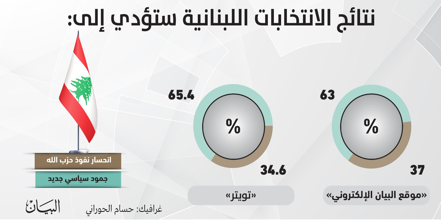 «البيان» في استطلاع طرحته في موقعها الإلكتروني وفي حسابها في موقع التواصل الاجتماعي «تويتر»، تطرقت إلى انعكاسات هذه الانتخابات على المشهد السياسي في البلاد إذ قال 63 في المئة من المستطلعة آراؤهم عبر الموقع إن لبنان مقبل على جمود سياسي جديد وهو ما أيده 65.4 في المئة من المشاركين في الاستطلاع عبر «تويتر» في حين أكد 37 في المئة من المستطلعة آراؤهم في الموقع أن نتائج الانتخابات ستؤدي إلى انحسار نفوذ حزب الله وهو ما أشار إليه أيضاً 34.6 من المشاركين في الاستطلاع عبر «تويتر».