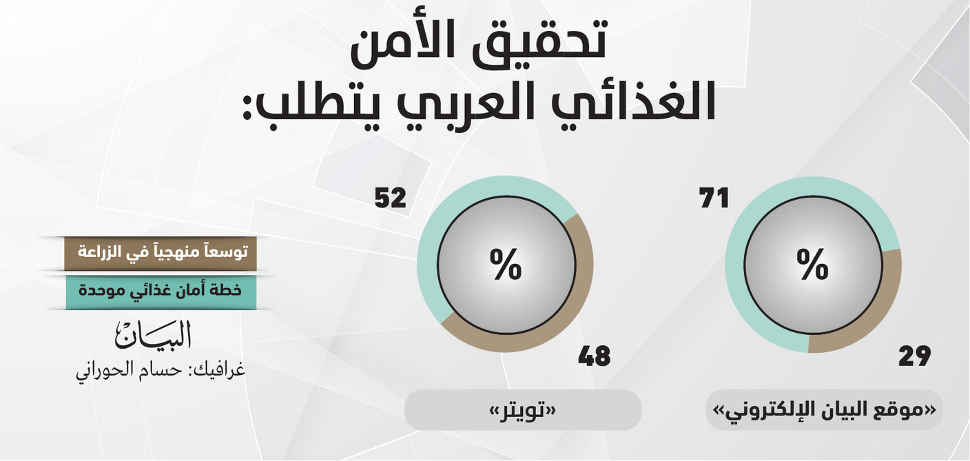 أظهر استطلاع للرأي، أجرته «البيان» على موقعها الإلكتروني، وعلى حسابها في «تويتر»، أن تحقيق الأمن الغذائي العربي، يتطلب خطة أمان غذائي موحدة، وهو ما عبّر عنه 71 في المئة من المستطلعة آراؤهم عبر الموقع، و52 في المئة من المستطلعة آراؤهم عبر «تويتر»، في حين ذهب 29 في المئة في الموقع، إلى أن الأمن الغذائي العربي، يتطلب توسعاً منهجياً في الزراعة، وهو ما ذهب إليه 48 في المئة من المشاركين في الاستطلاع عبر «تويتر».