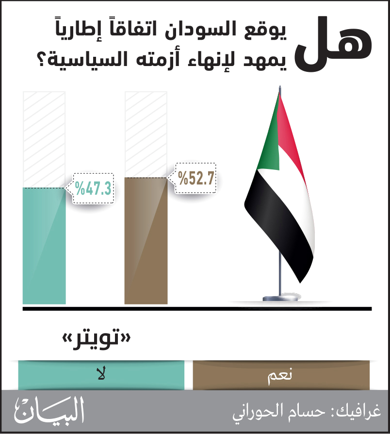 قدم استطلاع للرأي أجرته «البيان» على حسابها في «تويتر» رؤية تفاؤلية للمستطلعة آراؤهم حول الأزمة السياسية في السودان، حيث قال 52.7 % إن السودان مقبل على توقيع اتفاق إطاري يمهد لإنهاء هذه الأزمة التي أثقلت كاهل السودانيين وكانت لها تداعيات على جميع مناحي حياتهم، فيما استبعد 47.3 % التوصل لهذا الاتفاق، وبالتالي استمرار الأزمة.