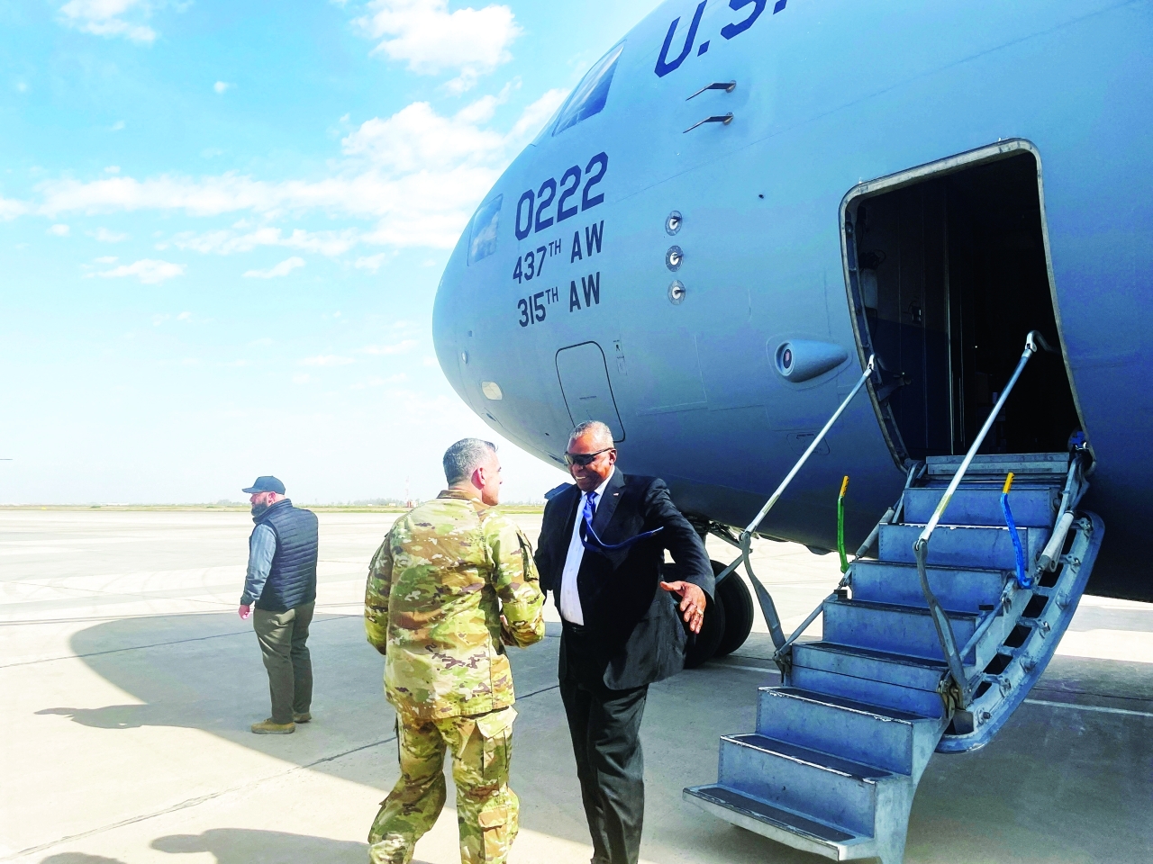 والتقى أوستن في بغداد بنظيره العراقي ثابت العباسي ورئيس الوزراء محمد شياع السوداني. وقال للصحافيين عقب محادثاته إن الولايات المتحدة ستواصل «تعزيز وتوسيع شراكتنا لدعم أمن العراق واستقراره وسيادته». وأشار أوستن إلى أن «القوات الأمريكية مستعدة للبقاء في العراق بدعوة من الحكومة العراقية.