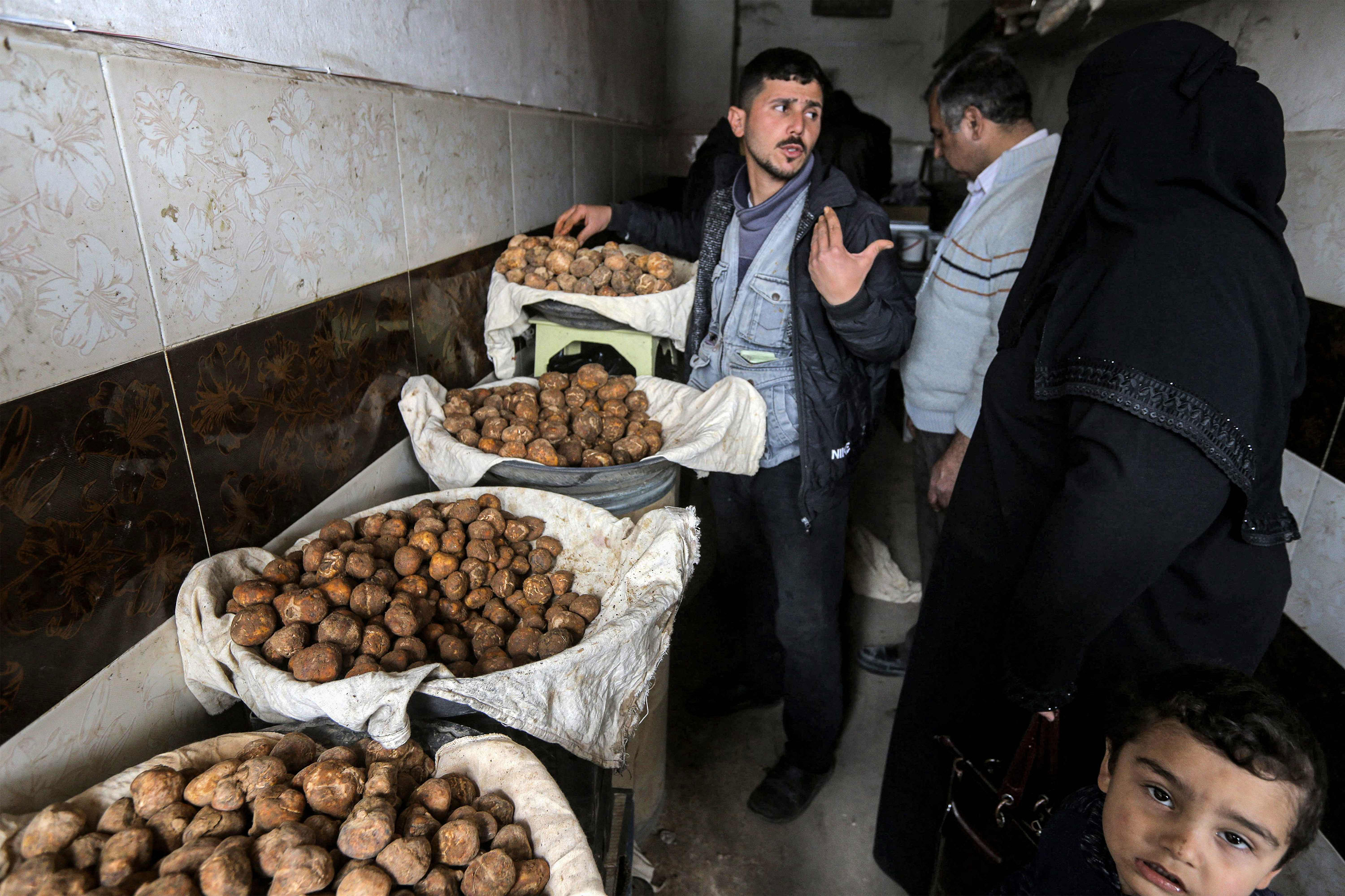في سوق الحاضر، يعرض محمّد صلحة (31 عاماً) أكياساً من الكمأة لبيعها، بعدما جال مدة أسبوع في مناطق صحراوية قريبة من قريته العلية في ريف حماة الشرقي.