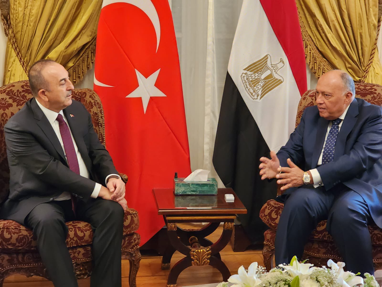 ووفق المتحدث، استقبل الوزير شكري وزير خارجية تركيا بمقر وزارة الخارجية في القاهرة وعقدا اجتماعاً ثنائياً مغلقاً.