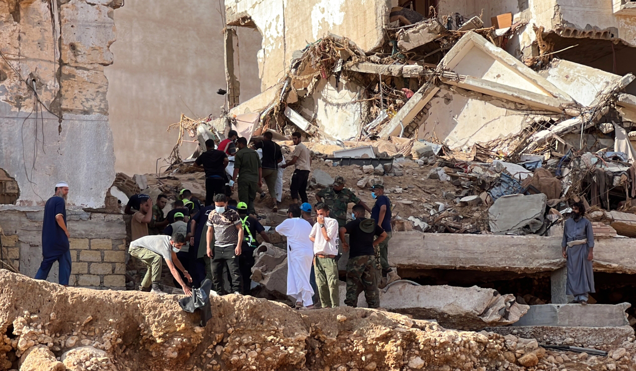 تواصل فرق الإنقاذ المحلية والأجنبية في مدينة درنة الليبية وباقي المناطق المتضررة من الإعصار والفيضانات جهودها في البحث عن مفقودين وإخراج أحياء من وسط الركام، مع تأكيدات الصليب الأحمر بأنه لا يزال هناك أمل في العثور على ناجين في المناطق المنكوبة، كما يكافح السكان وعمال الإغاثة للتعامل مع آلاف الجثث التي أعادتها الأمواج لليابسة أو تتحلل تحت الأنقاض، فيما دعت منظمة الصحة العالمية ومنظمات إغاثة، السلطات الليبية إلى التوقف عن دفن ضحايا الفيضانات في مقابر جماعية.