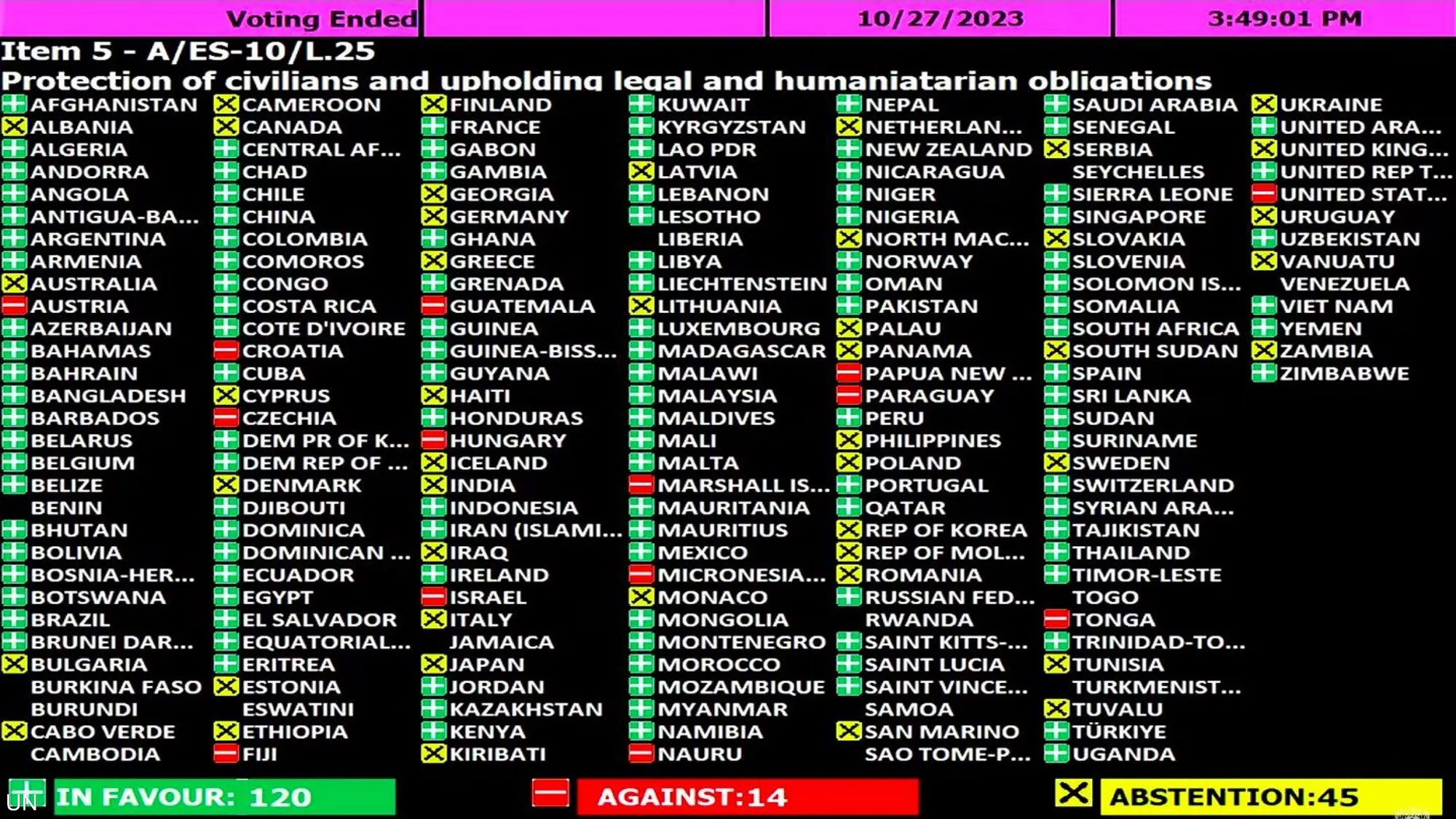 والقرار غير الملزم الذي انتقدته إسرائيل والولايات المتحدة لعدم إشارته إلى حركة حماس، أيّده على وقع التصفيق 120 صوتا من بينهم فرنسا وبلجيكا، حيث امتنعت 45 دولة عن التصويت من بينها العراق وتونس عربياً وألبانيا وبريطانيا وصربيا وأستراليا والدنمارك وألمانيا وكندا والهند والأوروغواي، إلى جانب معارضة 14 صوتا من بينهم هنغاريا والتشيك والباراغواي وكرواتيا وتونغا وغينيا وجزر المارشال وفيجي وميكرونيسيا إلى جانب إسرائيل والولايات المتحدة .