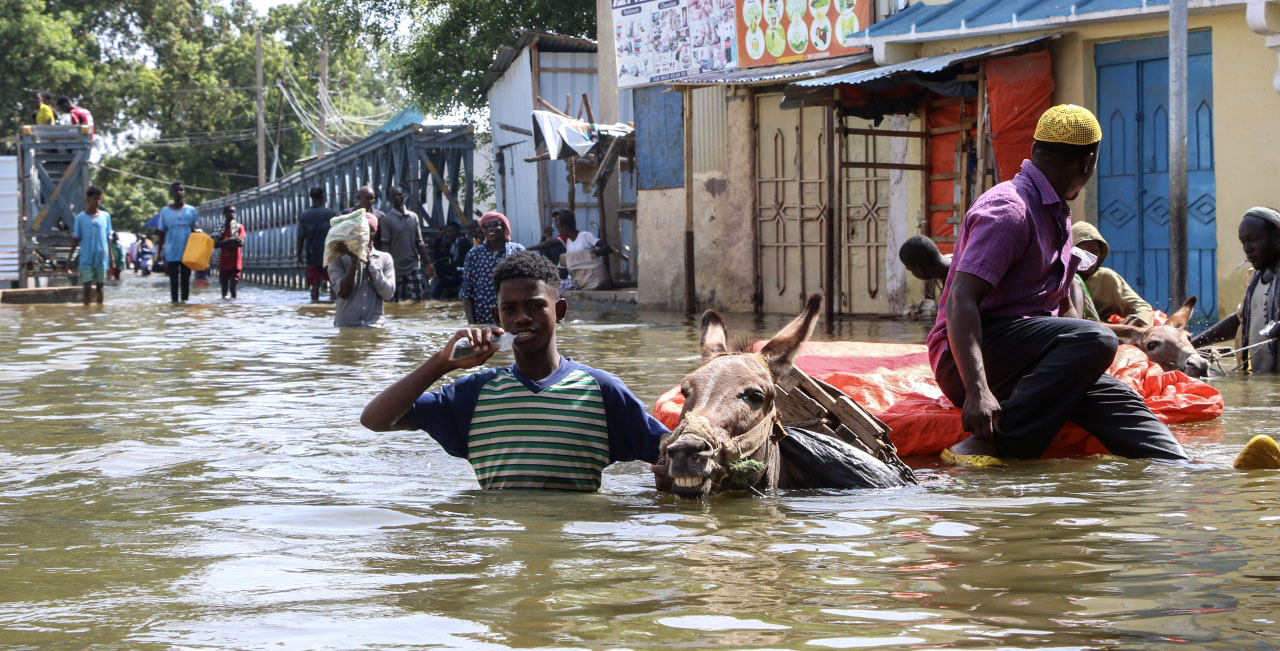 وشهدت منطقة القرن الأفريقي أمطاراً غزيرة وفيضانات مفاجئة في الأسابيع الأخيرة، مرتبطة بظاهرة النينيو المناخية، ما تسبّب في مصرع العشرات ونزوح أعداد كبيرة من السكان، ولا سيما في الصومال حيث دمرت الأمطار الغزيرة جسوراً وأغرقت مناطق سكنية. وقال رئيس الهيئة الوطنية لإدارة الكوارث في الصومال محمود معلم عبدالله في مؤتمر صحفي الإثنين إن «50 شخصاً لقوا حتفهم في الكارثة بينما اضطر 68,7235 شخصاً إلى الفرار من ديارهم».