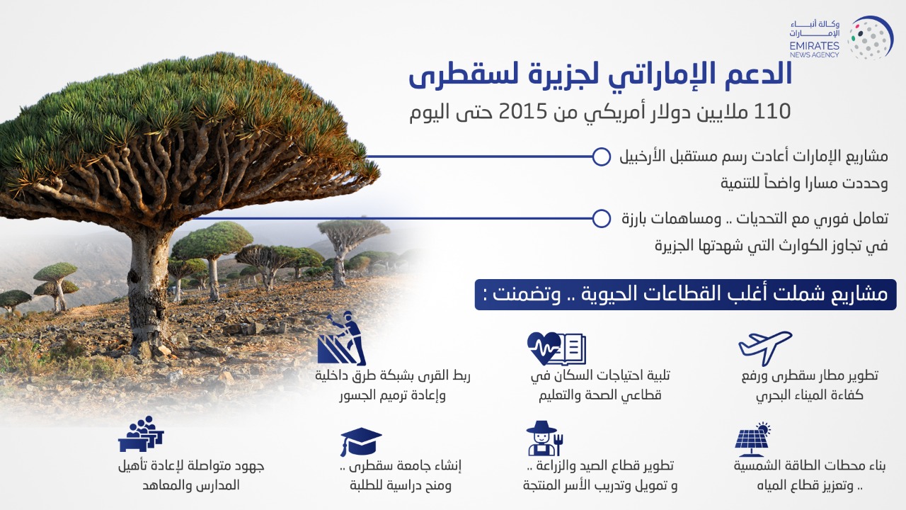 وفي سياق متصل دعمت الإمارات جهود تأهيل وتطوير ميناء سقطرى عبر إضافة رصيف بحري بطول 90 مترا وزيادة الغاطس لعمق أربعة أمتار ونصف لإرساء السفن الكبيرة، إضافة لبناء محطات للطاقة الشمسية.