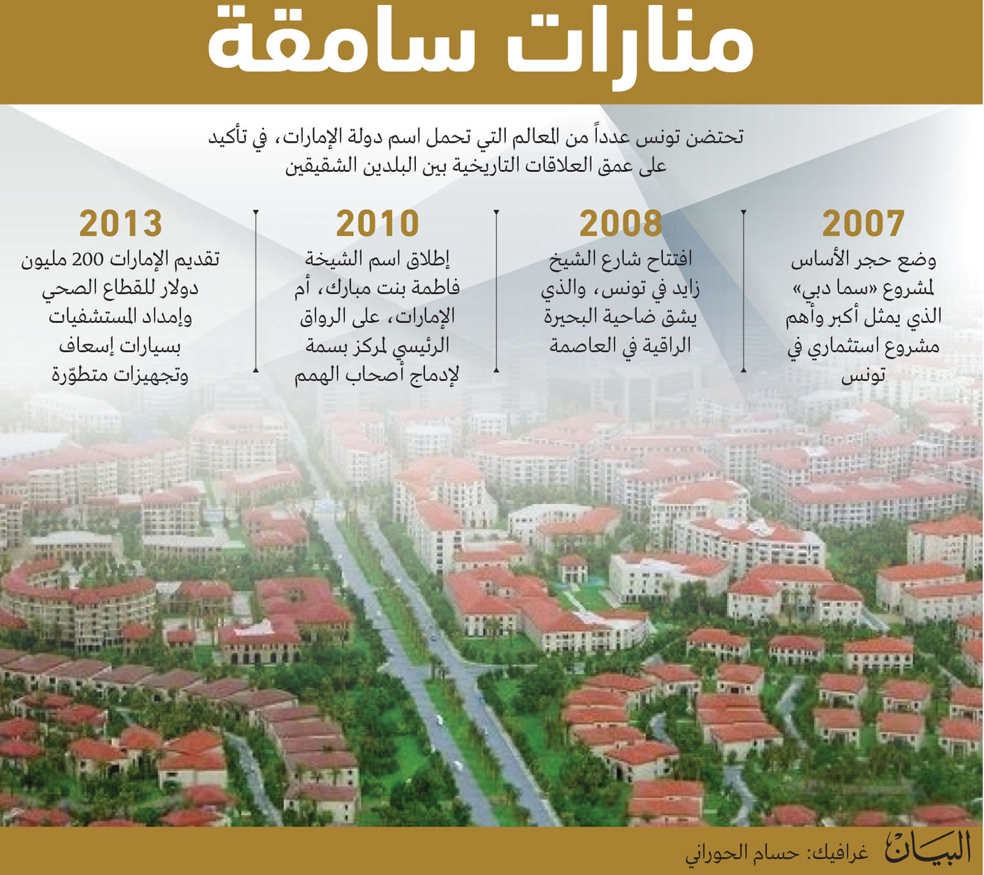 وبما يعكس العلاقات المتينة على مدار خمسة عقود بين الإمارات وتونس، وهي العلاقات التي أرسى قواعدها المغفور له بإذن الله الشيخ زايد بن سلطان آل نهيان، طيب الله ثراه. وتبرّع المغفور له بإذن الله الشيخ زايد بن سلطان في منتصف السبعينيات لإنشاء مدارس ثانوية في تونس، لا تزال شاهدة على أياديه البيضاء وإسهاماته التنموية في مختلف المحافظات. وأنشأ المغفور له بإذن الله الشيخ زايد بن سلطان قرية العامرة التي يرتبط إنشاؤها باسمه.