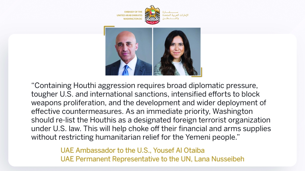 أكد معالي يوسف العتيبة، سفير دولة الإمارات لدى الولايات المتحدة، والسفير فوق العادة مفوض معالي لانا زكي نسيبة، مساعد وزير الخارجية والتعاون الدولي للشؤون السياسية، المندوبة الدائمة للدولة لدى الأمم المتحدة، أن المتطرفين وداعميهم يهاجمون رؤية جديدة لمستقبل سلمي للشرق الأوسط. وكتب معاليهما في مقال مشترك بعنوان: «افرضوا عقوبات صارمة ودبلوماسية حازمة لعزل الحوثيين في اليمن» بصحيفة «وول ستريت جورنال» الأمريكية، أن الحوثيين أطلقوا وابلاً جديداً من الصواريخ الباليستية والكروز والطائرات المسيرة المسلحة، على مواقع مدنية في دولة الإمارات، وفي ثالث هجوم لهم خلال الأسابيع الأخيرة، مشيريْن إلى أن الدفاعات الجوية لدولة الإمارات والولايات المتحدة، أسقطت معظمها، فيما تمكن البعض من المرور في وقت سابق من يناير، لتسقط بمحيط مطار أبوظبي الدولي، ما أسفر عن مقتل ثلاثة مقيمين هنود وباكستانيين أبرياء، لافتين إلى أن الإدانة الدولية الواسعة للهجوم تعكس الإجماع العالمي على أن تجاهل الحوثيين للخسائر المدنية واستهداف البنى التحتية المدنية هو تهديد للسلام والأمن الجماعي.