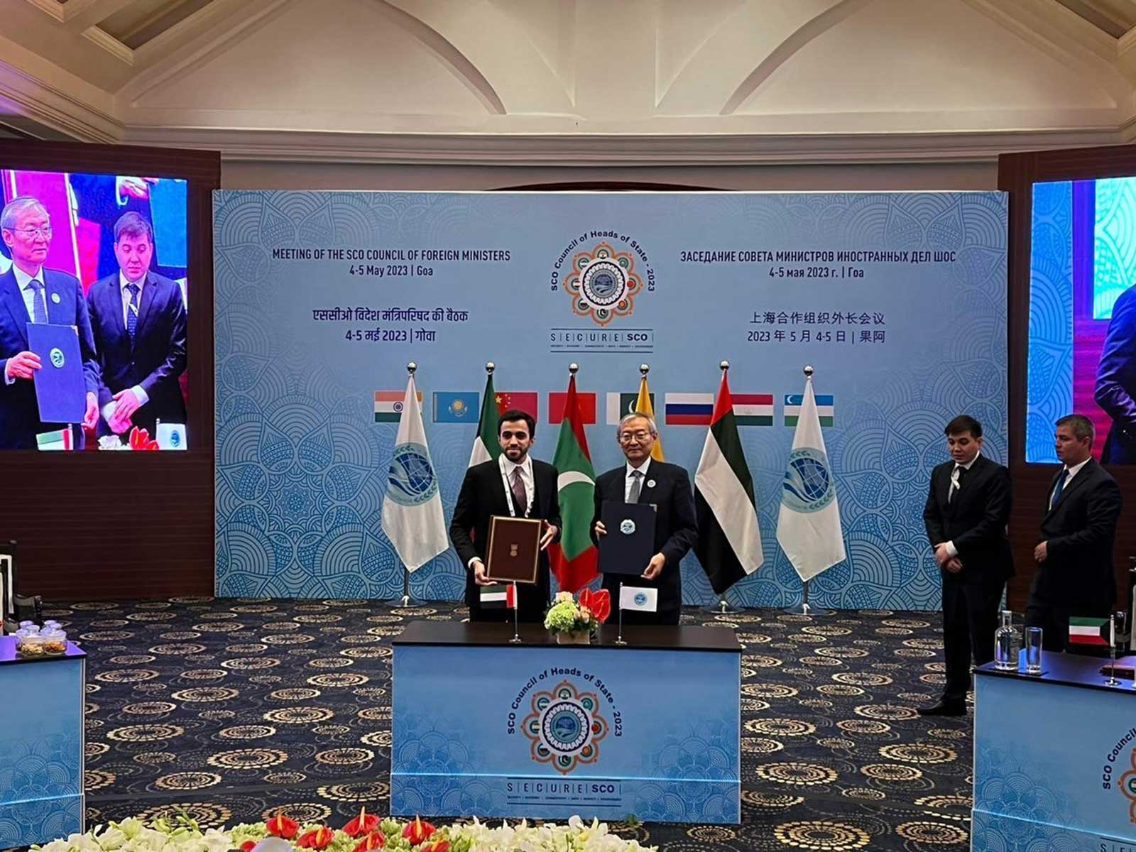 مُنحت دولة الإمارات رسمياً صفة "شريك حوار" في منظمة شنغهاي للتعاون، وذلك على هامش اجتماع مجلس وزراء خارجية المنظمة، والذي عُقد في غوا بجمهورية الهند يومي 4 و5 مايو 2023. حيث تُوّجَت مشاركة دولة الإمارات بالتوقيع على مذكرة تفاهم للانضمام إلى الرابطة كشريك حوار.