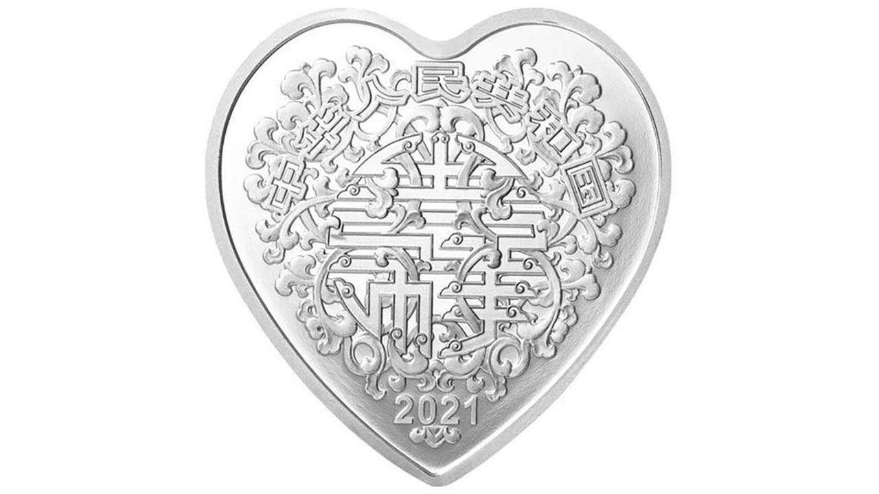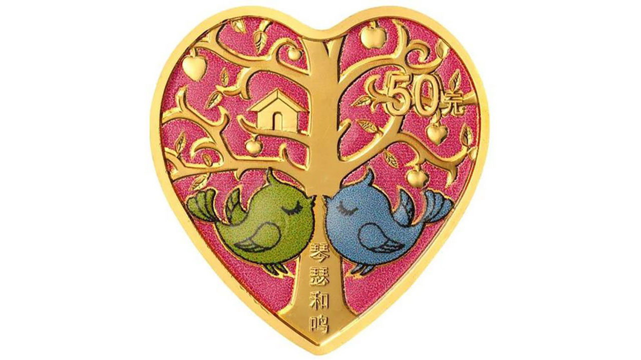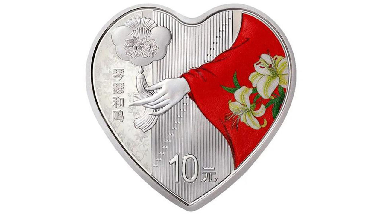 وتتميز العملة التذكارية "تشين سيه خه مينغ" (يعني الوئام والانسجام بين الزوجين في اللغة الصينية) الذهبية على شكل قلب بحجم 3 جرام والتي ستصدر في 20 مايو بنقوش تظهر مزيج من عصفورين وأشجار وفاكهة على ظهرها، بالإضافة إلى كلمات "تشين سيه خه مينغ" وفئة العملة، وفق صحيفة الشعب الصينية.