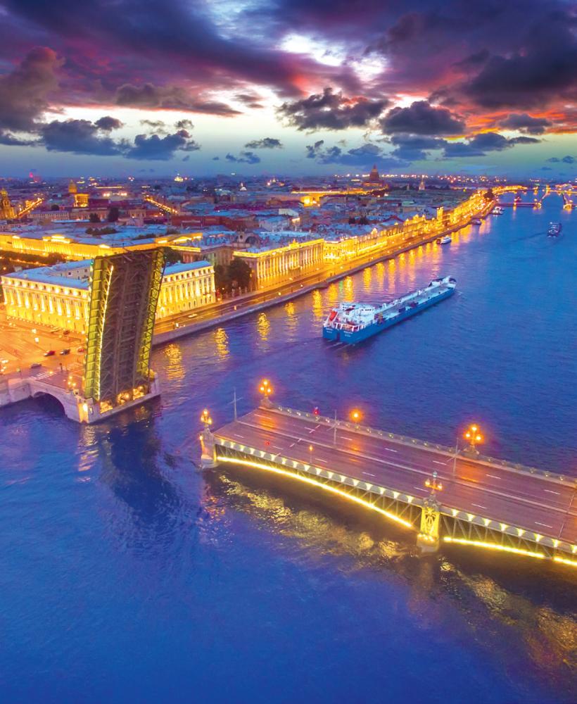 في هذه الفترة، تنغمس المدينة الشهيرة، التي كانت قرنين من الزمن عاصمة روسيا، في سحر الليالي البيضاء. وفي خضم هذا الوقت، تحدث ظاهرة مذهلة، حينما لا تتجاوز الشمس الأفق مدة 19 ساعة. ومع الاقتراب أخيراً من منتصف الليل، تختبئ المدينة في جو رائع من الشفق الوردي، حيث المكان والزمان يتغيران، ويبدأ الشعور كأن الليل لن يأتي أبداً، وتصبح المدينة الحجرية الرمادية ملونة فجأة، مضيفة سحراً وجمالية لجوها الإبداعي الخاص الذي يجذب الكتاب والفنانين والرومانسيين والشعراء.