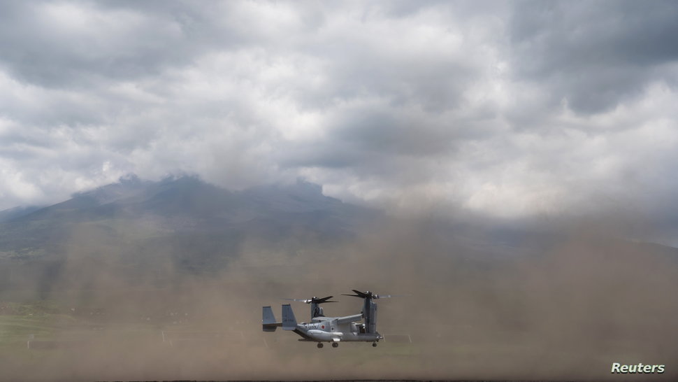 والطائرة أوسبري يمكن أن تقلع وتهبط مثل طائرة هليكوبتر وتحلق مثل طائرة تقليدية بجناحين. وكانت متمركزة في المحطة الجوية لمشاة البحرية في كامب بندلتون على بعد نحو 225 كيلومترا غربي جلامس.