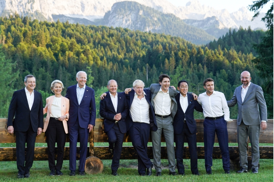 وعلى هامش قمة مجموعة السبع التي تستمر ثلاثة أيام في المنتجع الفاخر شلوس إلمو في جبال الألب البافارية، والتي بدأت أمس الأحد، وقف قادة دول المجموعة لالتقاط صورة من المرجح أن تصبح الصورة التي ترمز إلى قمة المجموعة.