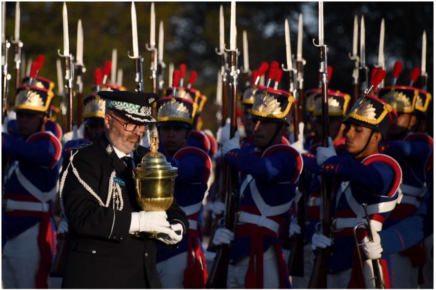 ورافق أفراد من فرقة "تنانين الاستقلال" جرة الذهب التي تزن تسعة كيلوغرامات وتحتوي على القلب المحنط للملك.