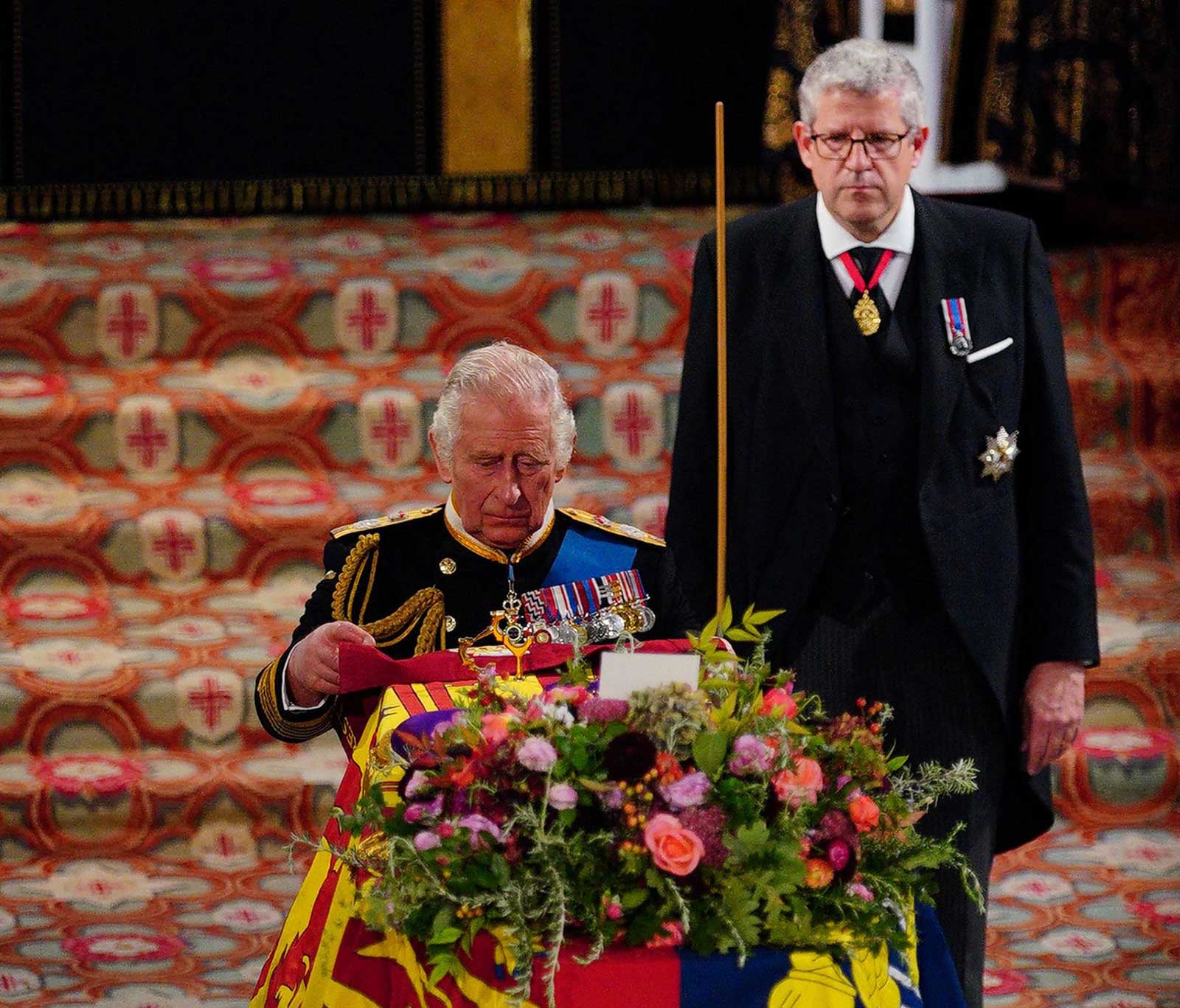 ترك ملك بريطانيا تشارلز رسالة قصيرة ورقيقة بخط اليد فوق نعش والدته الراحلة الملكة إليزابيث الثانية أثناء جنازتها اليوم في لندن.