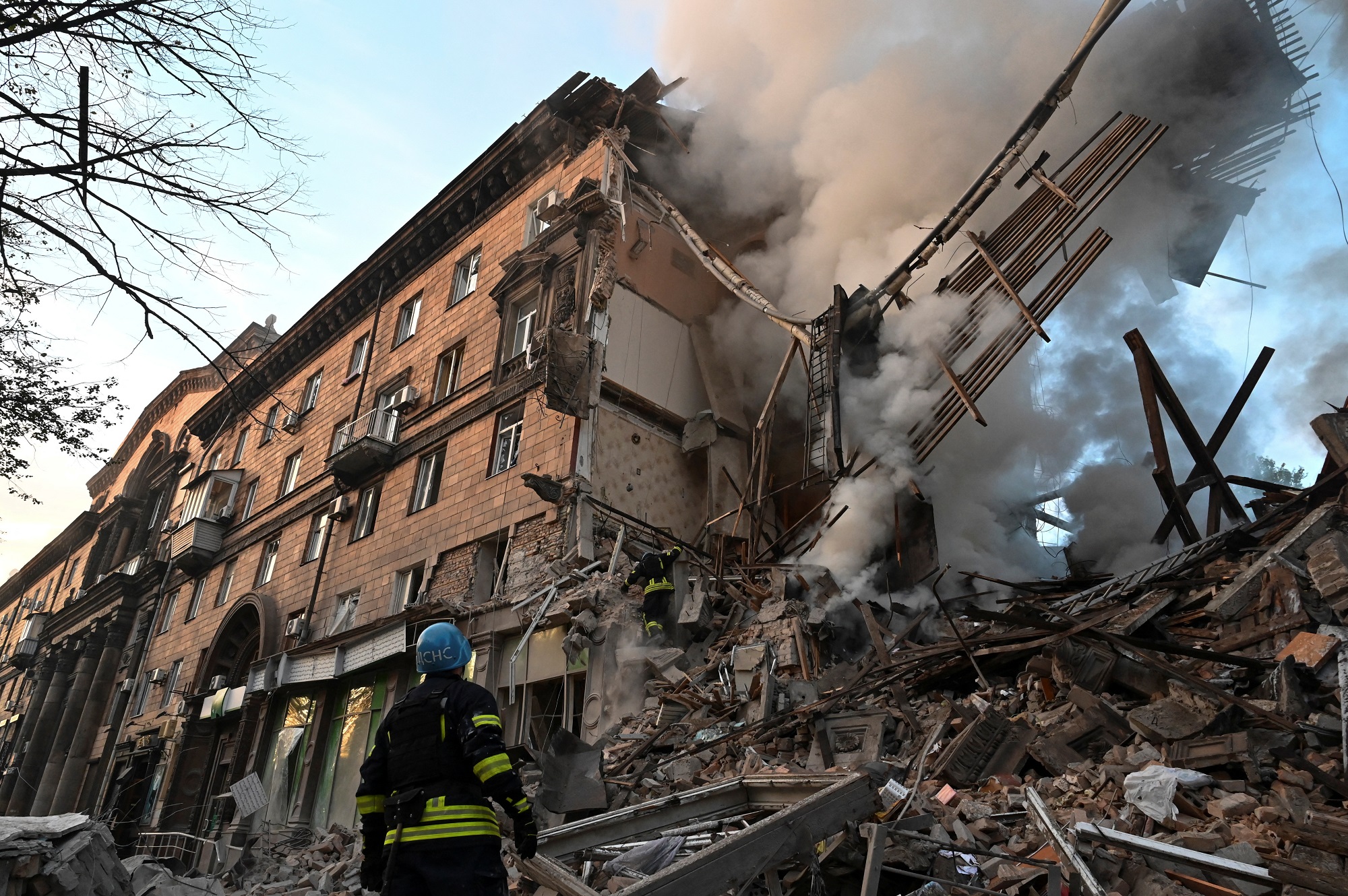وأصابت سبعة صواريخ زابوريجيا في الساعة الخامسة من صباح الخميس، سقطت ثلاثة منها على وسط المدينة. ونسف مبنى يطل على الشريان الرئيسي لهذه المدينة، بالكامل تقريبًا ولم يبق سوى الطابق الأرضي من طوابقه الخمسة. أما ما تبقى فقد أصبح ركاما.