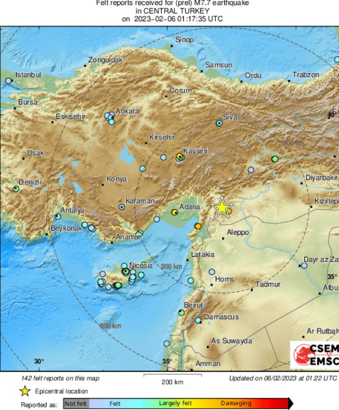 وأكد المركز الألماني أن قوة الزلزال بلغت 7.7 درجات على مقياس ريختر، بينما قدّر مركز الزلازل الأمريكي شدة زلزال تركيا بـ7.9 درجات.