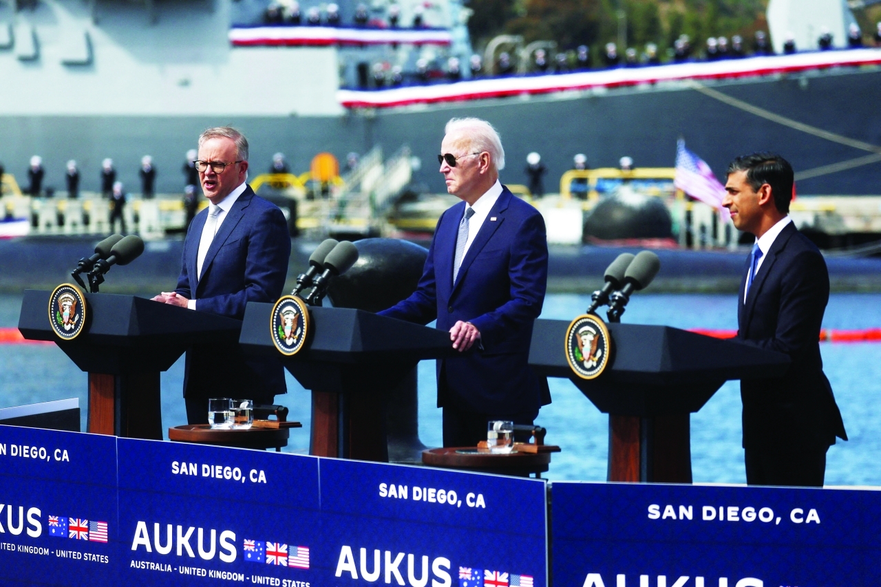 وعقدت قمة في سان دييغو بكاليفورنيا، أول من أمس، أعلن خلالها الرئيس الأمريكي، جو بايدن، ورئيس الوزراء البريطاني، ريشي سوناك، ورئيس الوزراء الأسترالي، أنتوني ألبانيز، تفاصيل المرحلة الأخيرة لاتفاق «أوكوس» لتزويد أستراليا بغواصات تعمل بالطاقة النووية. وبموجب الاتفاق تحصل أستراليا على أول غواصات تعمل بالطاقة النووية.