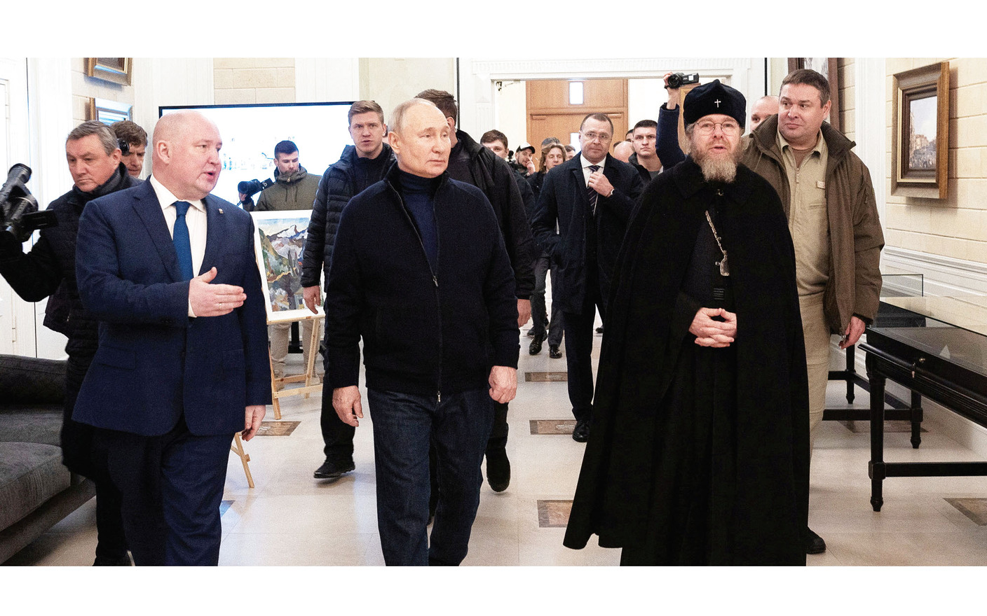 زار الرئيس الروسي فلاديمير بوتين شبه جزيرة القرم، أمس، في الذكرى التاسعة لانضمام شبه الجزيرة عام 2014 إلى روسيا، حسبما أعلن التلفزيون الروسي العام، بعد بضعة أيام على الاحتكاك الجوي الروسي الأمريكي فوق البحر الأسود، ليس بعيداً عن شبه جزيرة القرم، فيما أعلنت أوكرانيا أنها تعرضت لوابل من القصف من مسيرات متفجرة، وصل بعضها إلى منطقة لفيف غربي أوكرانيا، قرب الحدود البولندية. وفي زيارة مفاجئة إلى سيفاستوبول، الميناء الرئيس لأسطول البحر الأسود الروسي في القرم، زار بوتين مدرسة للفنون بصحبة الحاكم المحلي ميخائيل رازوغاييف، والمتروبوليت تيخون شيفكونوف، وفقاً لصور بثتها قناة روسيا- 1 التلفزيونية.