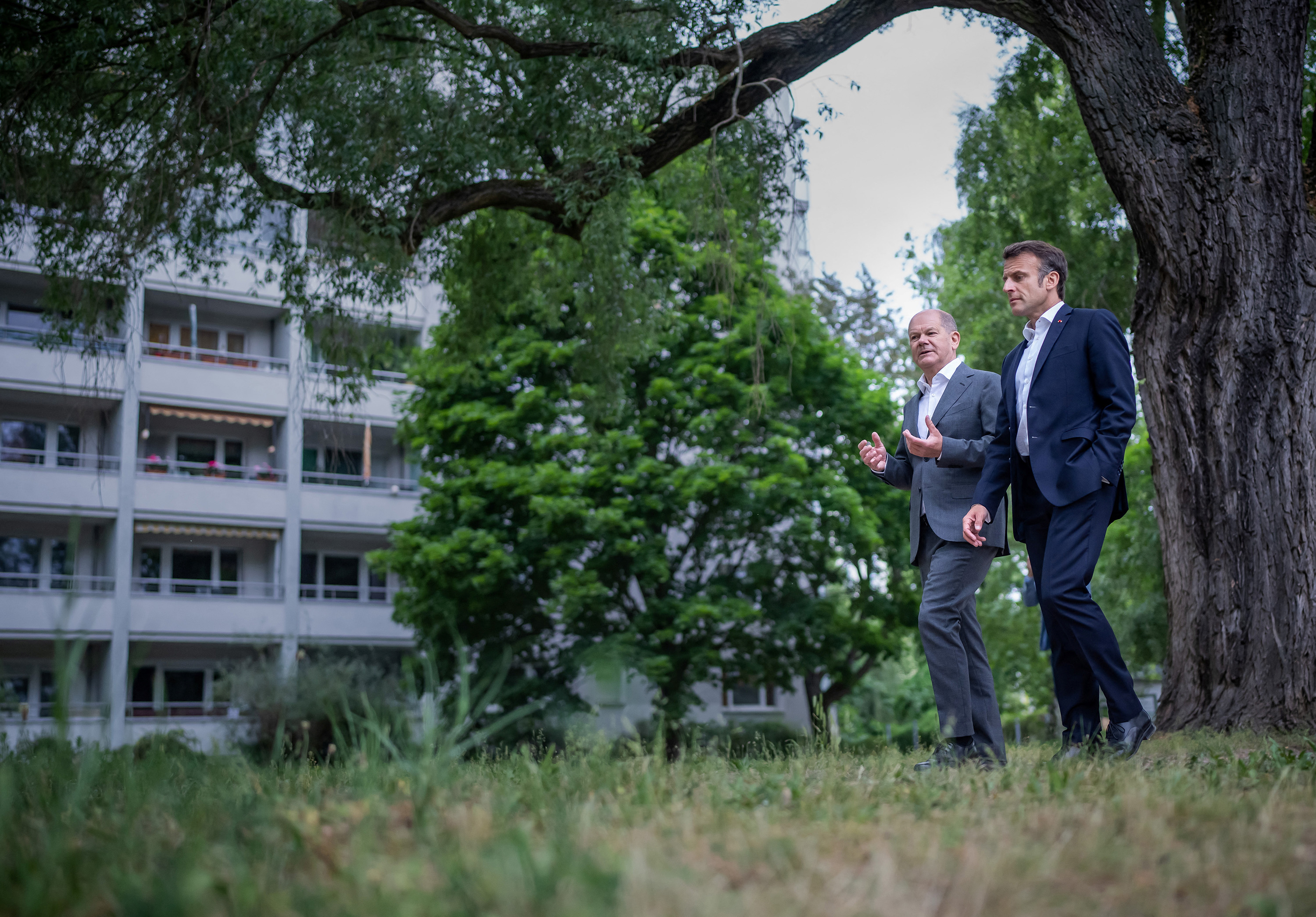 اصطحب المستشار الألماني أولاف شولتس الرئيس الفرنسي إيمانويل ماكرون في جولة سير غير مقررة حول وسط مدينة بوتسدام قبل عشاء عمل.