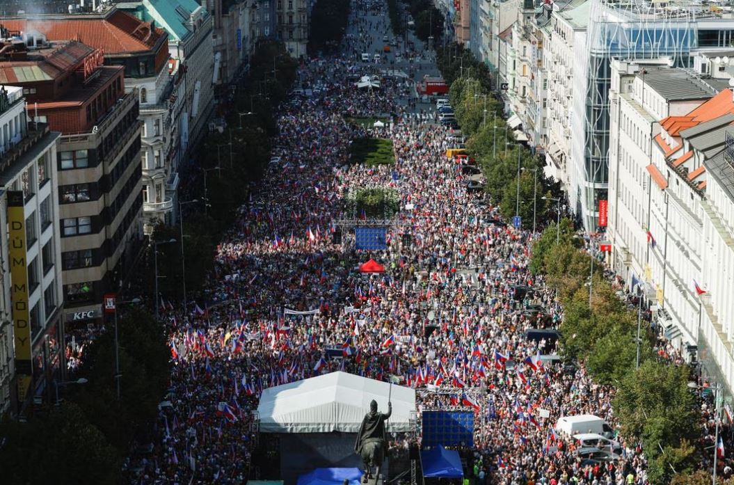 ولوّح المتظاهرون بالأعلام التشيكية وطالبوا حكومة رئيس الوزراء اليميني بيتر فيالا بالاستقالة، منددين أيضا بالتباطؤ الاقتصادي في الدولة العضو في الاتحاد الأوروبي.