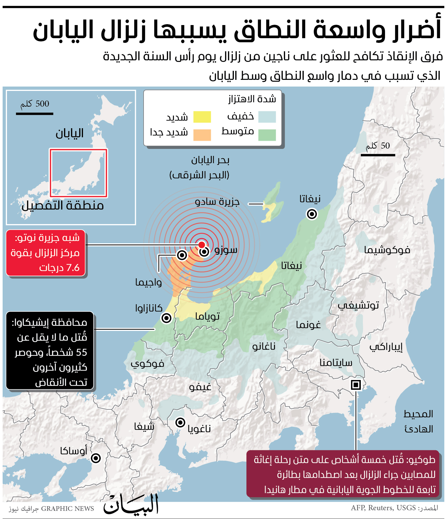 ووقع الزلزال الذي أشارت التقارير الأولية إلى أن قوته 7.6 درجة بعد ظهر يوم الاثنين في شبه جزيرة نوتو وتسبب في تسوية منازل بالأرض وعزل مناطق نائية عن مساعدات سكانها في أمس الحاجة إليها.