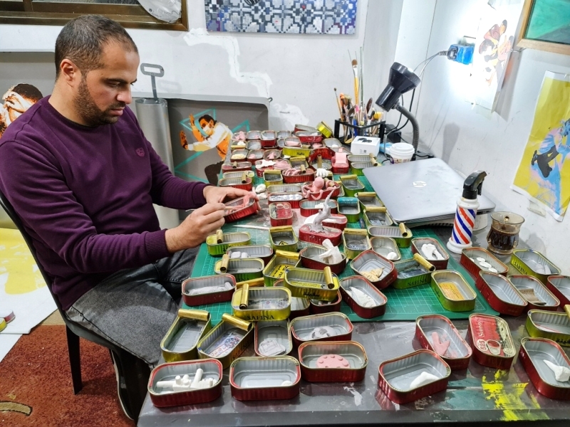 ونجح جحلش في تجهيز 250 علبة سردين، على مدار أكثر من 100 يوم، رسم داخل كل واحدة منها رسمة، أو وضع مجسماً، وكل واحدة تناقش قضية معينة.
