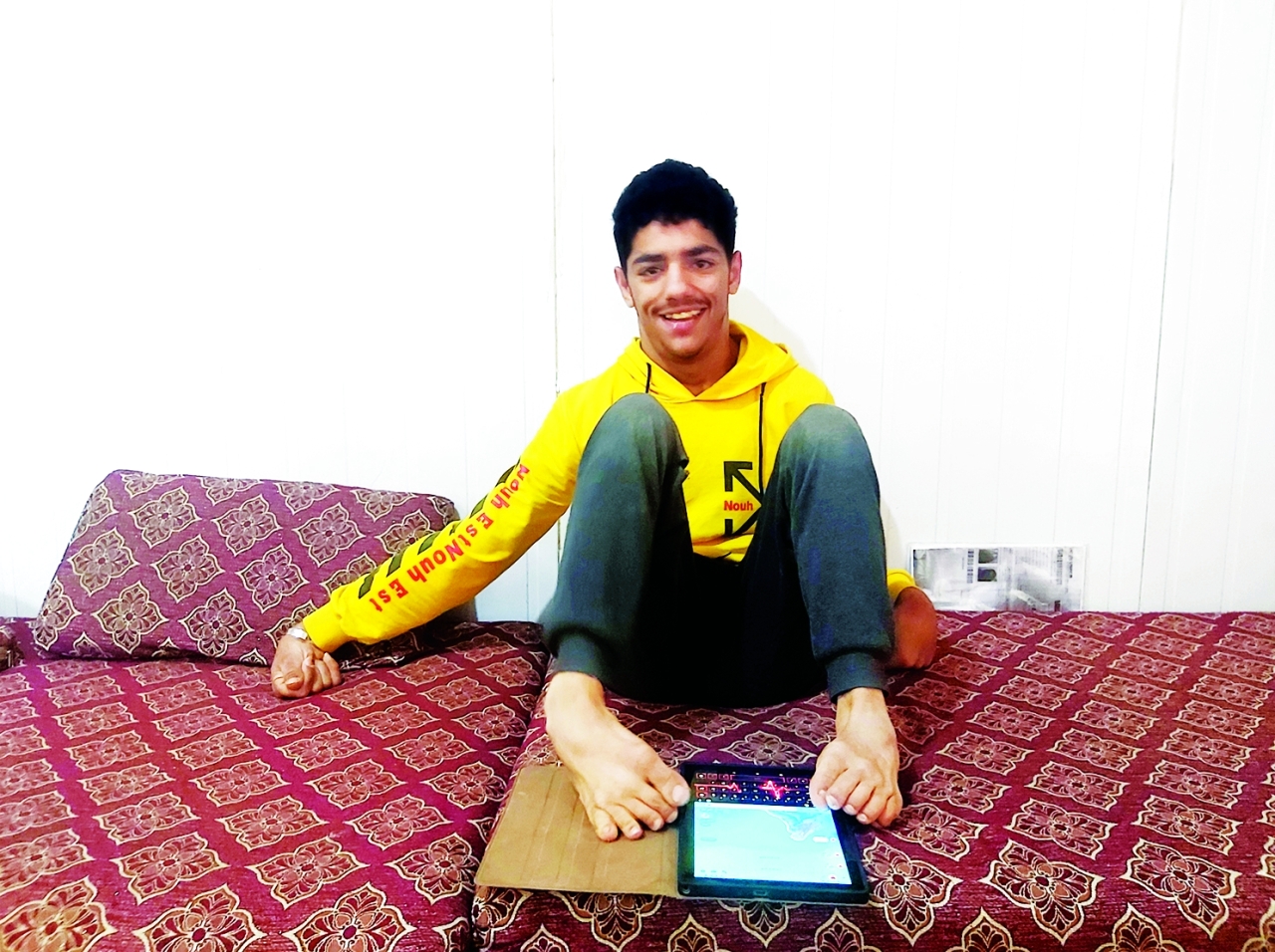 لم يقف الشاب أحمد أصعيب عاجزاً أمام إعاقته الحركية، بل استطاع بإرادته وإصراره إدارة الخيارات المتاحة أمامه تحت سقف «الكرفان»، الذي يقطنه وسط مخيم الزعتري للاجئين السوريين، وبعزيمته وبمساعدة والدته، التي ترافقه كظله أينما ذهب، تمكن من استخدام أصابع قدميه في الكتابة على الهاتف وجهاز «الآيباد»، ليعبر عما يريد، ويتواصل مع المحيط الذي هو جزء منه، وعبر هذه المهارات كسر حالة الوحدة التي كان يخشاها.